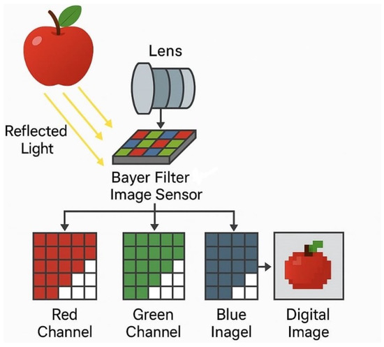 Optical RGB sensors capture images by analyzing the light reflected by objects in the visible spectrum. The general flow of this process is illustrated in Figure 1. The light is initially directed to the lens system, which serves as a focusing and concentrating device, directing the light rays onto the surface of the image sensor. Before reaching the sensor, the light passes through a color filter, commonly a Bayer matrix, which divides the spectrum into three main bands: red (R), green (G), and blue (B) [20]. This filter is composed of a specific arrangement of microfilters placed over the photodetectors, allowing each one to record only one of the three spectral components. Each color component is detected by a particular subset of photodetectors that measure the luminous intensity at its respective wavelength. This partial distribution of information is then compensated for by an interpolation process known as demosaicing, which enables the reconstruction of a complete color image. The result is a digital image where each pixel contains numerical values representing the intensity of each color channel.
