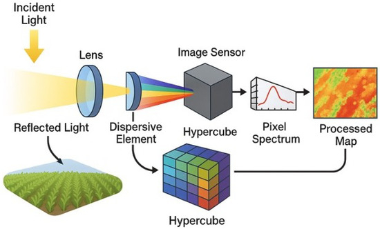Hyperspectral sensors are composed of several fundamental elements, as shown in Figure 2. These include the light source, which can be natural (such as sunlight) or artificial; the optical systems, such as lenses and mirrors, that focus the light; the dispersive elements that separate the light into different wavelengths, such as prisms or diffraction gratings; the detector (CCD or CMOS), which captures the intensity of the light in each band; and the acquisition and processing system, which digitizes and stores the data for later analysis.