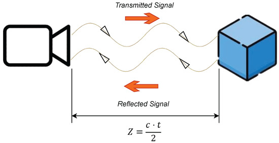 Time-of-Flight (ToF) cameras measure the time it takes for light to travel from an emitter to an object and back to the sensor. This principle allows the generation of three-dimensional images of the environment. This type of camera emits a beam of infrared light, which reflects off the surfaces in the environment and is subsequently detected again by the sensor. As shown in Figure 3, the transmitted signal travels to the object and, after reflection, returns to the sensor, allowing the distance to be calculated using the formula: