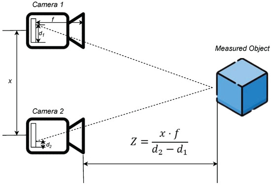 The operating principle of the stereo vision system is based on the triangulation principle. This principle utilizes the disparity between images captured by two cameras positioned at different locations to calculate the distance of an object in three-dimensional space. Each camera projects the object onto its respective image plane, generating two reference points ( and ). The displacements of these points depend on the location of the object with respect to the cameras. As shown in Figure 4, the difference between these offsets, known as disparity (), is inversely related to the depth of the object (Z). Using a mathematical formula that incorporates the distance between the cameras (x), the focal length of the lenses (f), and the disparity, the distance of the object from the plane of the cameras can be accurately calculated. This method leverages the distinct perspectives captured by the cameras, simulating the way human eyes perceive depth in space.