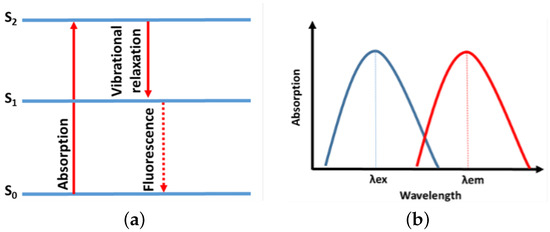Fluorescence spectroscopy takes advantage of the ability of specific molecules (referred to as “fluorophores”) to absorb photons in the ultraviolet-visible region. These molecules subsequently re-emit the absorbed energy at longer wavelengths, typically in the visible or near-infrared range. This phenomenon, known as the Stokes shift, occurs because part of the absorbed energy is dissipated non-radiatively before being emitted. Both the energy loss and the subsequent radiative transition are depicted in a Jablonski diagram under the Franck-Condon principle (see Figure 5a) [27]. When a ground-state molecule () absorbs a photon of energy , an electron is promoted vertically to an excited singlet state ( or ) in approximately s. This transition occurs without any instantaneous change in nuclear geometry. In less than s, the fluorophore dissipates excess vibrational energy to its surroundings through vibrational relaxation. As a result, it settles into the lowest vibrational level of . From this equilibrated state, the electron may return to by emitting a photon in the process known as fluorescence [28]. Two key parameters used to quantify the fluorescence are the quantum yield: