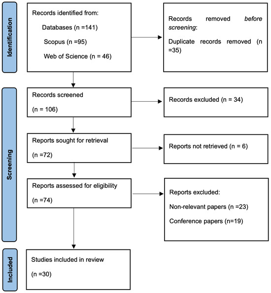 The initial search yielded a total of 141 records, of which 81 were retrieved from Scopus and 107 from Web of Science. After removing 35 duplicate entries, 106 articles proceeded to the title and abstract screening phase. At this stage, 34 studies were excluded because they were not directly related to the application of artificial vision or optical techniques in plant growth. Subsequently, 30 full-text articles were selected for inclusion based on their methodological rigor, relevance, and contribution to the research questions.
