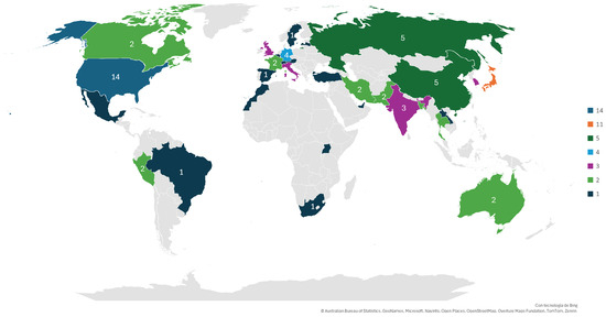 Figure 8 presents an analysis of scientific publications by geographical distribution related to artificial vision and optical techniques for plant growth measurement. The results reveal that 21 countries have contributed at least one article, while 174 countries have not published in this area. This uneven distribution highlights a concentration of research in a limited number of countries. These countries are characterized by advanced scientific infrastructure and well-developed technological capabilities. The five leading countries in scientific production on this subject are the following: