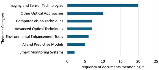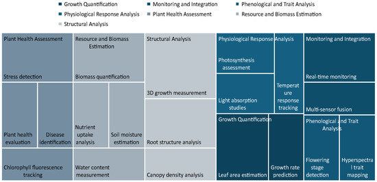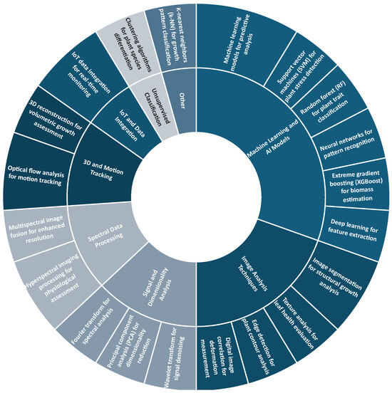 According to the findings of the reviewed studies, critical characteristics were identified in the development of optical and artificial vision methods for evaluating plant growth, as shown in Figure 9. These findings highlight the areas that require the most development and implementation. The identified characteristics were grouped into seven main thematic categories based on their technological and functional nature: