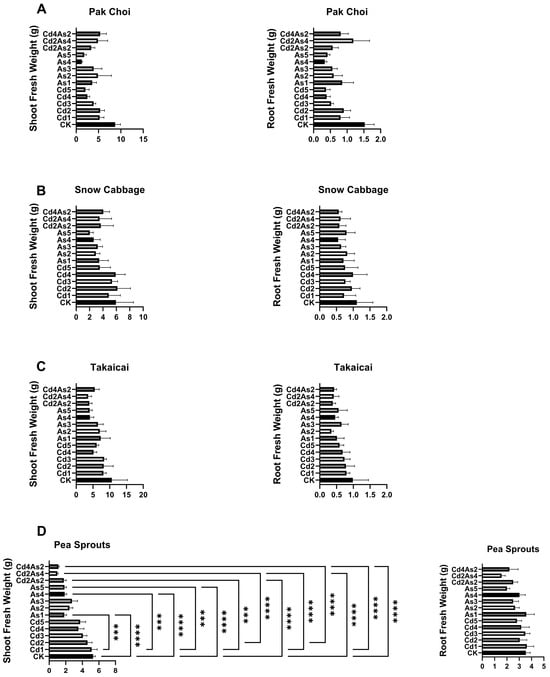 Tolerant and Sensitive Leafy Vegetables: Vegetable yields are presented in Figure 1. There were no significant differences in the fresh weights of the shoots and roots of pak choi, snow cabbage, and Takaicai under various treatments. Figure 1D, with p < 0.05 (n = 6), indicates that the shoot fresh weight of pea sprouts was significantly higher under the CK treatment than under Cd4As2, Cd2As4, Cd2As2, As5, As4, and As1 treatments; it was also significantly higher under the Cd1 treatment than under Cd4As2, Cd2As4, Cd2As2, As5, As4, and As1 treatments; and under the Cd2 treatment, it was significantly higher than under Cd4As2 and Cd2As4 treatments. However, there were no significant differences in the root fresh weight of pea sprouts among the treatments.