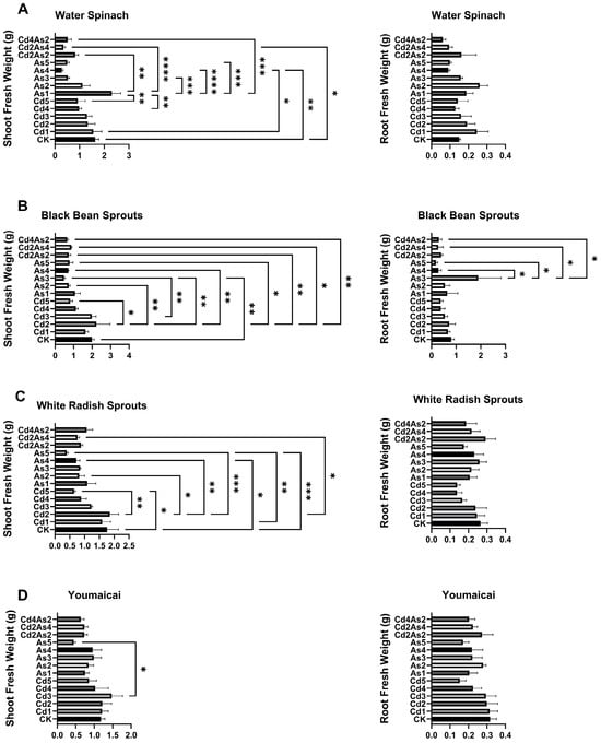 Moderately Tolerant Leafy Vegetables: As can be seen from Figure 2, except for black soybean sprouts, the water content in the roots of the other tested leafy vegetables did not change with heavy metal treatment. Figure 2A, with p < 0.05 (n = 6), shows that the shoot fresh weight of water spinach was significantly higher under the As1 treatment than under Cd4As2, Cd2As4, Cd2As2, As5, As4, As3, Cd5, and Cd4 treatments; it was significantly lower under the As4 treatment than under Cd1 and CK treatments; and under the Cd2As4 treatment, it was significantly lower than under the CK treatment. According to Figure 2B, with p < 0.05 (n = 6), the shoot fresh weight of Black Bean Sprouts was significantly higher under the Cd2 treatment than under Cd4As2, Cd2As4, Cd2As2, As5, As4, As3, As2, and Cd5 treatments. It was significantly lower under the As3 treatment than under Cd3 and CK treatments; under the As3 treatment, the root fresh weight was significantly higher than under Cd4As2, Cd2As4, As5, and As4 treatments. Figure 2C, with p < 0.05 (n = 6), reveals that the shoot fresh weight of white radish sprouts was significantly higher under the Cd2 treatment than under Cd2As4, As5, As4, As2, and Cd5 treatments; it was significantly higher under the CK treatment than under As5, As4, and Cd5 treatments; and under the As5 treatment, it was significantly lower than under the Cd1 treatment. Figure 2D, with p < 0.05 (n = 6), indicates that the shoot fresh weight of Youmaicai was significantly higher under the Cd3 treatment than under the As5 treatment.