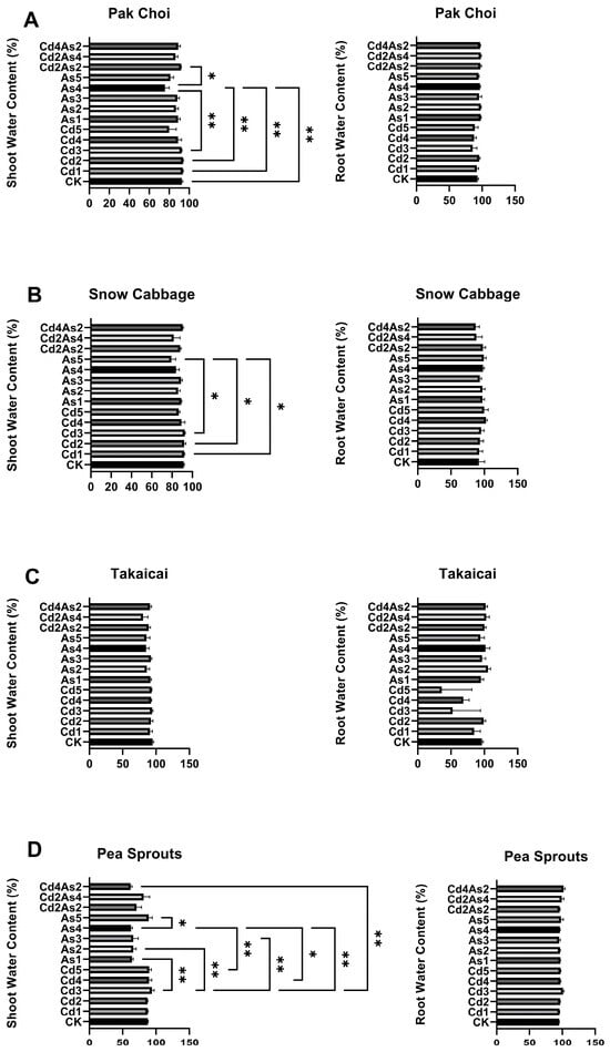 Tolerant and Sensitive Leafy Vegetables: From Figure 3 and Figure 4, it can be observed that the moisture content of the tested leafy vegetables was not affected by the experimental treatments. As indicated by Figure 3A, where p < 0.05 (n = 3), under As4 treatment, the water content in the aerial parts of pak choi was significantly lower than that under Cd2As2, Cd3, Cd2, Cd1, and CK treatments. According to Figure 3B, where p < 0.05 (n = 3), under As5 treatment, the water content in the aerial parts of snow cabbage was significantly lower than that under Cd3, Cd2, and Cd1 treatments. Figure 3C shows no significant difference in the water content of both aerial parts and roots of Takaicai under different treatments. From Figure 3D, where p < 0.05 (n = 3), under Cd3 treatment, the water content in the aerial parts of pea sprouts was significantly higher than that under Cd4As2, As4, As3, As2, and As1 treatments; under As4 treatment, its aerial water content was significantly lower than that under Cd4, Cd5, and As5 treatments.
