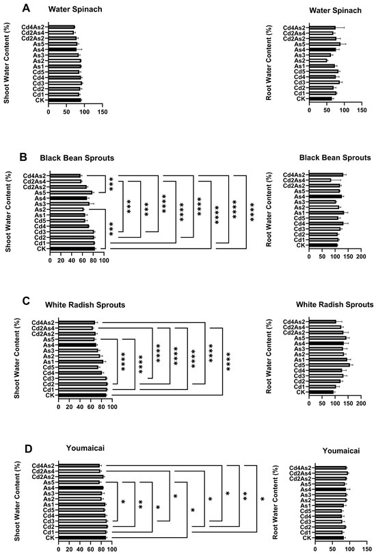 Trends in the water content of moderately tolerant leafy vegetables (A–D) under different heavy metal treatments. Note: *, **, *** and **** denote statistical significance at the 0.05, 0.01, 0.001 and 0.0001 levels, respectively (n = 3). (A–D) represent water spinach, black bean sprouts, and white radish sprouts, and Youmaicai, respectively.