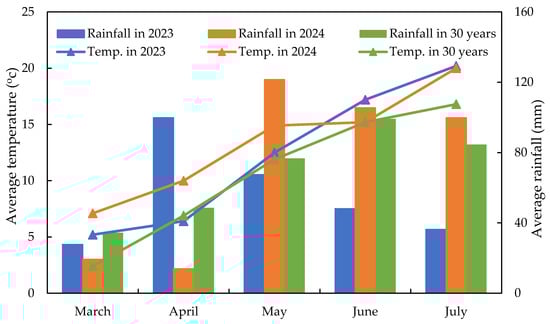 The weather conditions during the two-year experiment and long term are given in Figure 1. The average air temperature during our research period was higher compared to the multi-year period (2023 season, 12.3 °C; 2024 season, 13.4 °C; and the multi-year period, 10.6 °C; Figure 1). The total rainfall from March to July in the 2023 season was lower than in 2024 and multi-year periods (279 mm, 360 mm, and 343 mm, respectively) (Figure 1). In the 2023 season, the temperature after sowing was lower compared to 2024 and the multi-year period. Rainfall in April 2024 was lower than in April 2023, whereas in May, June, and July 2024, it was higher than in the same months in 2023.