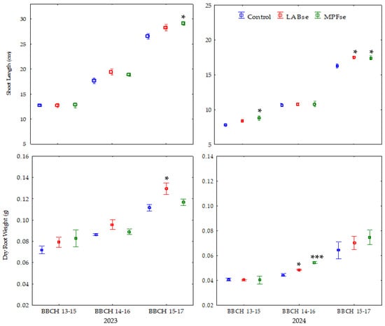 The treatment of pea seeds with LAB and MPF resulted in a significant increase in shoot length (p < 0.001) and dry root (p = 0.007) (Table 3). Specifically, during the BBCH15–17 growth stage in the 2023 season, significant differences were observed in root length for the MPF seed treatment and in root dry weight for the LAB seed treatment compared to the untreated control. (Dunnett’s test, p < 0.05). The root length recorded was statistically similar at the BBCH13–15, BBCH15–17 stages, and the root dry weight at the BBCH14–16 stage in the 2024 season (Figure 2).