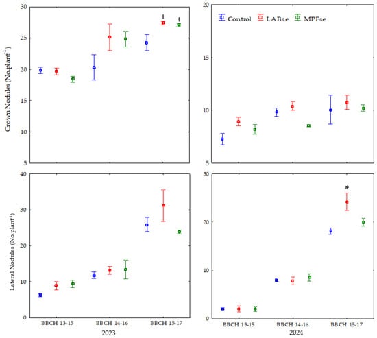 The root nodules of the seed treatment of LAB were significantly higher than (31.59 nodules. plant−1) in the untreated control (27.24 nodules. plant−1) and seed treatment of MPF (29.06 nodules. plant−1) (Table 3). Notably, at the BBCH15–17 stage in the 2023 season, seed treatment resulted in a higher number of crown nodules compared to the untreated control (Dunnett’s test, p < 0.1). Seed treatment of LAB recorded nodules per plant and lateral nodules were higher than the untreated control (Dunnett’s test, p < 0.05) (Figure 3).