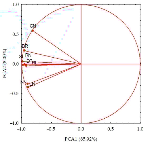 Principal components analysis (PCA) 1 and 2 demonstrating relationships among shoot length (SL), root length (RL), dry shoot weight (DS), dry root weight (DR), root nodules (RN), crown nodules (CN), lateral nodules (LN) of seed treatment of pea grown under field conditions in 2023 and 2024.