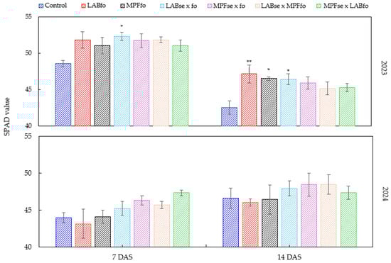 In 2023, at 7 days post-foliar application, SPAD values in the treated plants increased by approximately 5–8% compared to the untreated control. Notably, a statistically significant difference was observed in the seed treatment combined with foliar application of LAB compared to the untreated control (Dunnett’s test, p < 0.05). Similarly, at 14 days post-application, SPAD values increased by 6.1–10.8% compared to the untreated control. The result of Dunnett’s test also showed that the foliar and seed treatment (Dunnett’s test, p < 0.01), foliar application with LAB and MPF (Dunnett’s test, p < 0.05) showed significant differences from the control. In contrast, no significant differences were observed between foliar application treatments and the control at 7 or 14 days after application in 2024 (Figure 5).