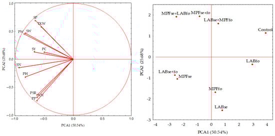 In the multivariate analysis of different treatments, the seed treatment with MPF, the seed and foliar application with LAB, and the combined MPF seed treatment with LAB foliar application were positively correlated with seed yield and protein content. In contrast, the untreated control, seed treatment with LAB, foliar application with LAB, and MPF were negatively correlated with seed yield and protein content (Figure 6).