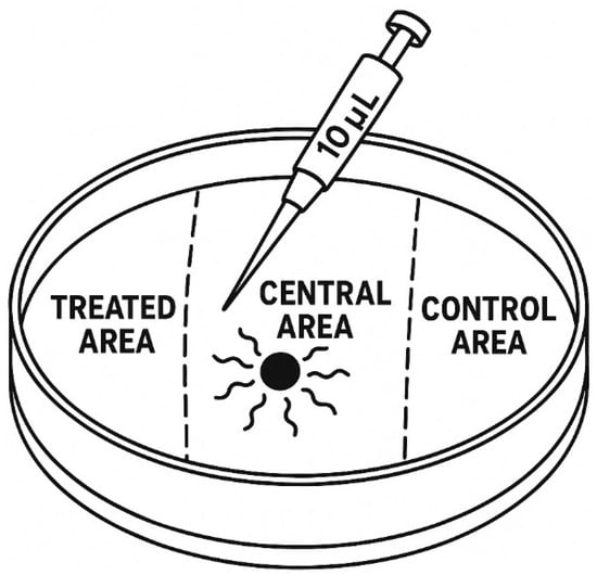 Each Petri dish was divided into three areas (see Figure 1): a treated area, a control area, and a central area. Volatile organic compounds (VOCs) were applied to the left side of each dish (the treated area), and an equal volume of solvent (96% ethanol) was applied to the right side (the control area). Approximately 100 infective juveniles (IJs) were suspended in the M9 buffer and pipetted into the center of each dish (the central area), ensuring consistent initial positioning.