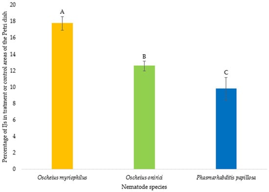 Mean percentage (±standard error) of infective juveniles (IJs) of three nematode species—Oscheius myriophilus, Oscheius onirici, and Phasmarhabditis papillosa—that migrated from the central area to the treatment or control areas of the chemotaxis assay dish. Different capital letters above the bars indicate statistically significant differences among species based on Duncan’s multiple range test (p < 0.05).