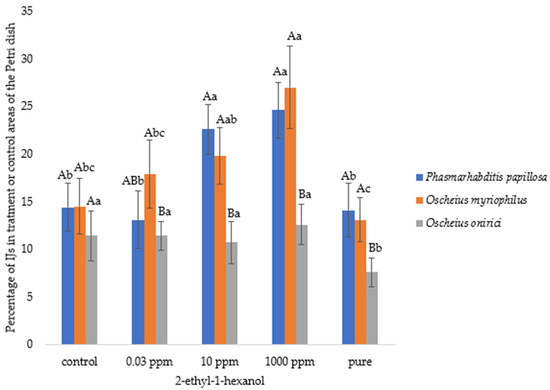 Mean percentage (±standard error) of infective juveniles (IJs) of Phasmarhabditis papillosa, Oscheius myriophilus, and Oscheius onirici migrating from the central zone of a Petri dish toward either the treatment (2-ethyl-1-hexanol at four concentrations: pure, 1000 ppm, 10 ppm, 0.03 ppm) or the solvent control (96% ethanol). IJ motility (%) was calculated as the proportion of individuals moving from the central application point toward either side of the dish (treatment or control), expressed as a percentage of the total IJs per replicate. Different capital letters above the bars denote statistically significant differences among nematode species within the same VOC concentration, while lowercase letters denote significant differences within the same nematode species across VOC concentrations (Duncan’s multiple range test, p < 0.05).