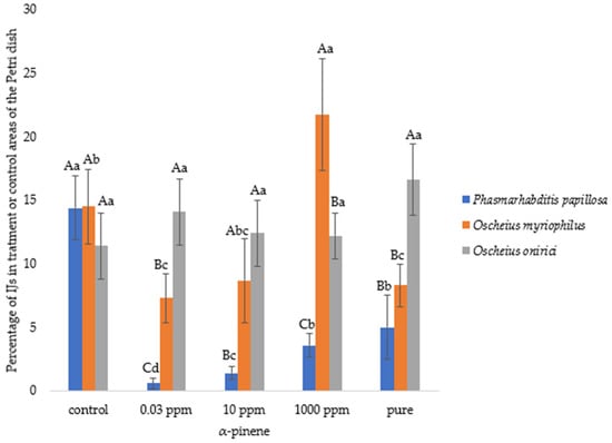Mean percentage (±standard error) of infective juveniles (IJs) of Phasmarhabditis papillosa, Oscheius myriophilus, and Oscheius onirici migrating from the central zone of the Petri dish toward either α-pinene (tested at pure, 1000 ppm, 10 ppm, and 0.03 ppm) or the 96% ethanol control. IJ motility (%) was calculated as the proportion of IJs leaving the central application point and moving toward either the treatment or control area, expressed as a percentage of the total nematodes per replicate. Different capital letters above the bars indicate statistically significant differences among nematode species within the same VOC concentration, while lowercase letters denote significant differences within the same species across different concentrations (Duncan’s multiple range test, p < 0.05).