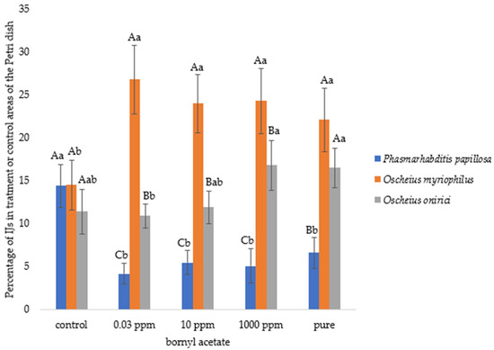 Mean percentage (±standard error) of infective juveniles (IJs) of Phasmarhabditis papillosa, Oscheius myriophilus, and Oscheius onirici migrating from the central zone of the Petri dish toward bornyl acetate (tested at pure, 1000 ppm, 10 ppm, and 0.03 ppm) or the 96% ethanol control. IJ motility (%) was calculated as the proportion of individuals leaving the central application point and moving toward either the treatment or control area, expressed as a percentage of the total nematodes per replicate. Different capital letters above the bars indicate statistically significant differences among nematode species within the same VOC concentration, while lowercase letters indicate significant differences within the same nematode species across concentrations (Duncan’s multiple range test, p < 0.05).
