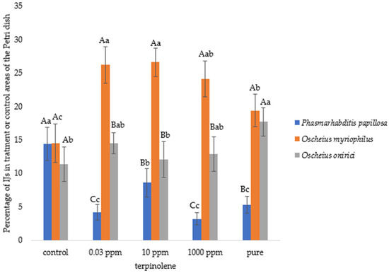 Regarding the mean percentage (±standard error) of infective juveniles (IJs) of Phasmarhabditis papillosa, Oscheius myriophilus, and Oscheius onirici migrating from the central zone of the Petri dish toward terpinolene (tested at pure, 1000 ppm, 10 ppm, and 0.03 ppm) or the 96% ethanol control, IJ motility (%) was calculated as the proportion of nematodes leaving the central application point and moving toward either the treatment or control area, expressed as a percentage of the total IJs per replicate. Different capital letters above the bars indicate statistically significant differences among nematode species within the same VOC concentration, while lowercase letters indicate significant differences within the same nematode species across concentrations (Duncan’s multiple range test, p < 0.05).
