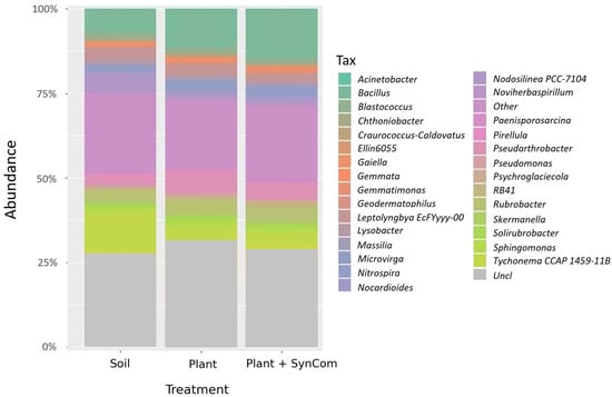 Alpha diversity was primarily assessed using the Shannon diversity index and showed no significant differences after the SynCom application (Figure 2a), suggesting that the inoculation of the SynCom had no effect on the diversity of the rhizosphere bacterial community. This lack of effect was confirmed by using other biodiversity indexes such as Chao 1, Simpson, and Faith PD. However, the beta-diversity analysis (Figure 2b) showed a clear difference between the soil and both rhizosphere communities. A difference was also observed between the non-inoculated and the SynCom-inoculated rhizosphere communities. Taken together, these results indicate that inoculation with the SynCom produced only slight changes in the rhizosphere community, the plant being the main driver of these changes.