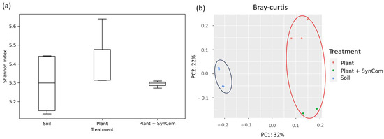 (a) Shannon’s alpha diversity index for the different treatments (Soil, Plant, and Plant + SynCom); (b) phylogenetic structure of microbial communities in the soil samples from different treatments. Ordination is based on a principal coordinate analysis.