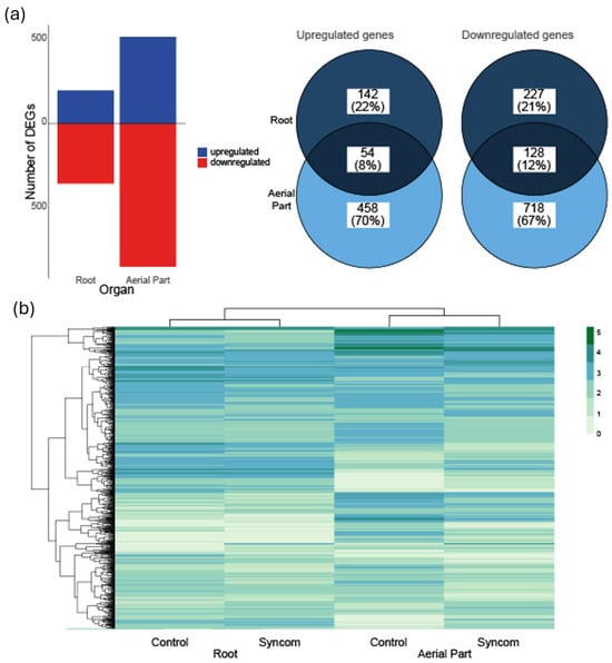 Transcriptional effect of the application of the SynCom. (a) Number of upregulated and downregulated differentially expressed genes (DEGs) in root and shoot tissues, and Venn diagrams comparing DEGs between organs. Diagrams indicate shared and tissue-specific DEGs based on differential expression between SynCom-inoculated and control plants; (b) heatmap of log10-transformed normalized expression counts for DEGs across all samples, including both control and SynCom-inoculated conditions, revealing root vs. aerial part’s transcriptional responses to bacterial inoculation.