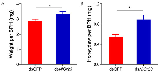 3.1. Effect of NlGr23 Knockdown on BPH Weight and Honeydew Production