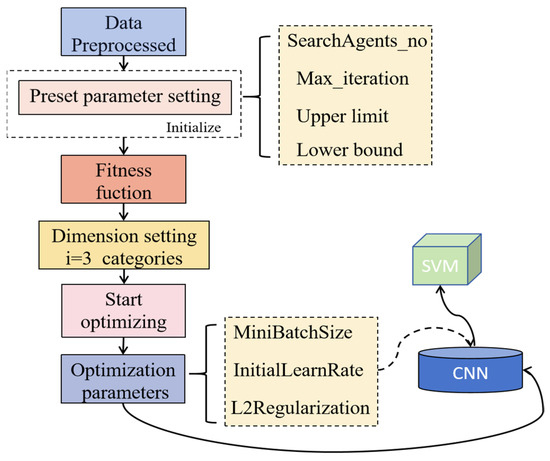The SSA, originally proposed by Xue and Shen and inspired by the foraging and anti-predatory behavior of sparrows [32], was employed in this study to optimize the hyperparameters of the CNN models. Specifically, SSA was used to tune the learning rate, batch size, and L2 regularization coefficient based solely on the training and validation sets, with the test set strictly excluded to prevent data leakage and ensure unbiased model evaluation. The hyperparameter search space was defined as follows: learning rate [1 × 10−3, 5 × 10−2], batch size [32, 128], and L2 regularization coefficient [1 × 10−5, 1 × 10−2]. SSA was executed using 20 individuals over 5 iterations, and the optimal combination of hyperparameters was determined based on validation accuracy. The final optimized values were a learning rate of 6.3 × 10−3, batch size of 32, and L2 regularization coefficient of 1 × 10−5. The CNN–SVM involves using a CNN-trained model for high-dimensional feature extraction, resulting in three-dimensional data. To enhance accuracy, the extracted three-dimensional feature data were fed into an SVM for classification model [33]. The schematic diagram is illustrated in Figure 2.