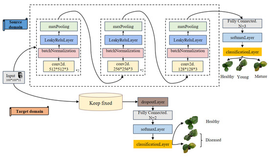 Transfer learning enhances performance on a related task by leveraging knowledge acquired from a previously learned task [34]. To enable the pre-trained CNN model to adapt to the characteristics of different eggplant genotypes, a transfer learning strategy was employed for model fine-tuning. The data used for transfer learning were collected from the inbred line “14-345” and included both inoculated and non-inoculated control groups. During fine-tuning, all five convolutional layers of the pre-trained model were frozen to preserve their ability to extract low-level generalizable features learned from the source task. To accommodate the new binary classification task (healthy vs. infected), the original fully connected layer designed for three-class classification was replaced with a new fully connected layer containing two output nodes. Additionally, a Dropout layer was inserted before the classifier to reduce the risk of overfitting. Throughout the fine-tuning phase, only the newly added Dropout and fully connected layers were trained, while the rest of the network architecture and parameters remained unchanged.