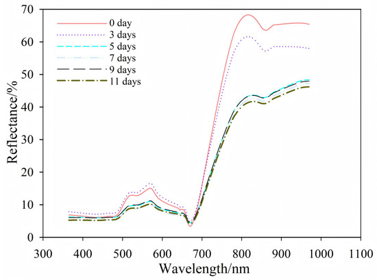 Figure 4 shows the average spectral reflectance of eggplant leaves from healthy (0 day) to infected (11 days). The healthy and infected leaves had similar overall patterns. However, differences appeared in the visible (515–660 nm) and near-infrared (780–970 nm) regions. Clear changes were seen at 0 day, 3 day, and after day 5.