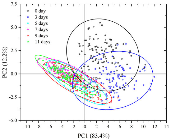 PCA was employed to examine the spectral reflectance of both healthy and infected leaves. The fractional scatter plots of PC1 and PC2 are presented in Figure 5. PC1 and PC2 collectively encompassed most spectral information, contributing to 95.6% of the total variance. Specifically, PC1 accounted for 83.4% of the explained variance, while PC2 accounted for 12.2%. As shown in Figure 5, the PCA score plot revealed a clear temporal progression among the samples. The leaves sampled on day 0 were distinctly distributed in the upper-right quadrant, while those samples from day 3 began to shift along the PC1 axis, indicating early spectral changes associated with infection. From day 5 onward, samples corresponding to later time points increasingly overlapped, suggesting progressive but spectrally similar physiological responses as disease symptoms developed. Based on the distribution of the PCA scores and their 95% confidence ellipses, the samples were categorized into three stages reflecting disease progression: healthy (day 0), pre-symptomatic (days 3 and 5), and symptomatic (days 7, 9, and 11). This PCA-based classification was subsequently used to generate training labels for model development and evaluation in early detection of Verticillium wilt.