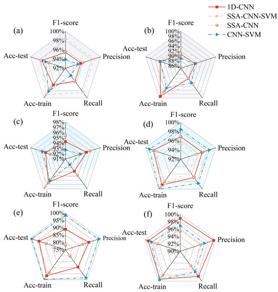 Radar charts compare model performance across six input feature types: (a) raw spectra; (b) fused spectra, and texture and CHIF data; (c) SPA + spectral features; (d) SPA + information fusion; (e) normalized + SPA + spectral features; (f) normalized + SPA + information fusion. Abbreviations: SPA: successive projections algorithm; NOR: normalization; 1D-CNN: one-dimensional convolutional neural network; SSA: sparrow search algorithm; CNN: convolutional neural network; SVM: support vector machine; Acc-train: Accuracy-train; Acc-test: Accuracy-test. F1-score, precision, and recall are the test set results.