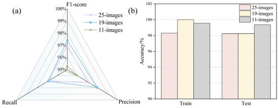 Comparative analysis of multi-source information fusion image model performance: (a) model recall, F1-score, and precision; (b) training set and test set accuracy.