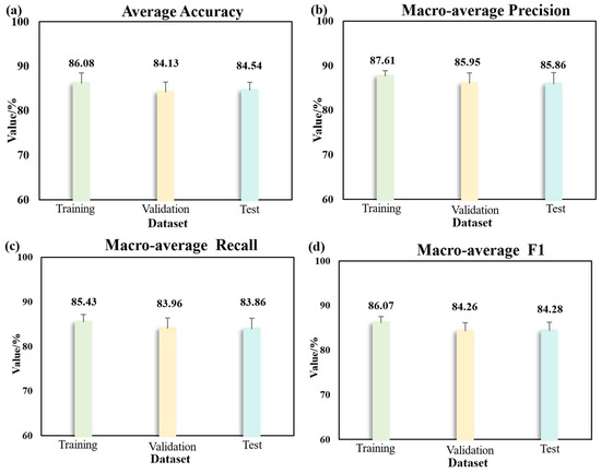 Classification results of early diagnosis based on transfer learning using five-fold cross-validation. (a) Average accuracy on training, validation, and test datasets; (b) macro-average precision on training, validation, and test datasets; (c) macro-average recall on training, validation, and test datasets; (d) macro-average F1 score on training, validation, and test datasets.