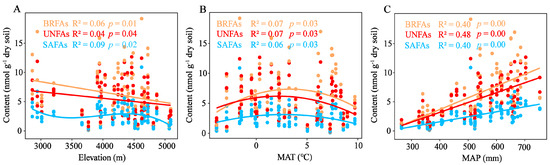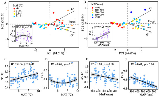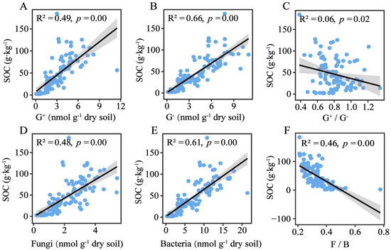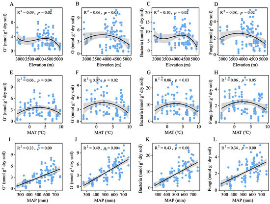 - At higher elevations (lower MAP/MAT), shifts in microbial community structure (higher G+/G− ratio and F/B ratio) adapt to harsher conditions. The increased G+/G− and F/B ratios correlate negatively with SOC storage, highlighting their role as key mediators of carbon storage.