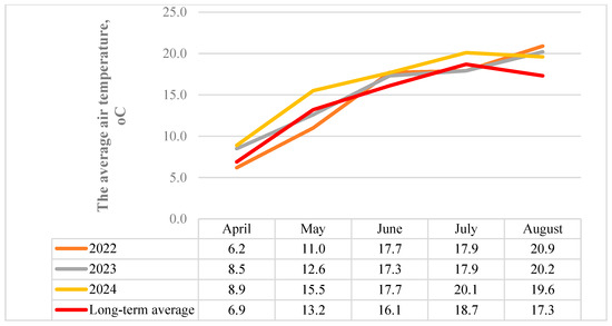 In 2022, April was colder (6.2 °C) and drier (33.7 mm) than the long-term average. The precipitation at the beginning (121.6 mm in May) and at the end (122.2 mm in August) of the crop vegetation period was higher (59.9 mm and 33.3 mm, respectively), and the temperature (11.0 °C in May) was lower than the long-term average (2.2 °C). The temperature in August (20.9 °C) was higher than the long-term average (3.6 °C). In June and July, precipitation was less than the multi-year average. In June, the temperature was 17.7 °C, and in July, it was 17.9 °C (Figure 1 and Figure 2).