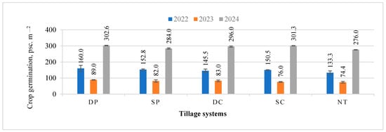 Spring barley crop germination after 10 days, under different tillage systems, 2022–2024. Note: DP—Deep plowing, SP—Shallow plowing, DC—Deep cultivation–chiseling, SC—Shallow cultivation–disking, NT—No-tillage. No significant differences at p > 0.05. Whiskers indicate standard errors of the means.