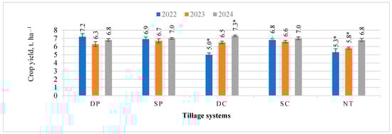 Spring barley crop yield under different tillage systems, 2022–2024. Note: DP—Deep plowing, SP—Shallow plowing, DC—Deep cultivation–chiseling, SC—Shallow cultivation–disking, NT—No-tillage. Differences significant at *—p ≤ 0.05 > 0.01. Whiskers indicate standard errors of the means.