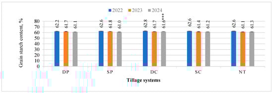 Starch content of spring barley grains under different tillage systems, 2022–2024. Note: DP—Deep plowing, SP—Shallow plowing, DC—Deep cultivation–chiseling, SC—Shallow cultivation–disking, NT—No-tillage. Differences significant at ***—p ≤ 0.001. Whiskers indicate standard errors of the means.