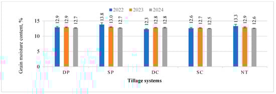 Based on the data from the 2022 survey, it can be concluded that the different tillage practices did not have a significant effect on the grain protein content. The results show that the fields with conventional tillage had the highest protein content compared to the reduced-tillage systems (Figure 6). Grain protein content in the years studied was low at 10.1%, equivalent to Grade 3 in terms of grain quality indicators.