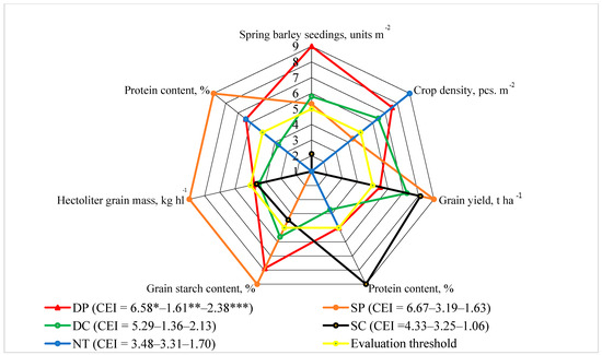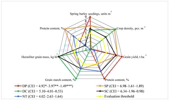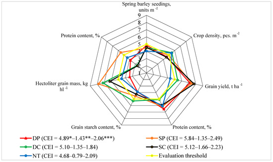 In 2022, the analysis showed that different tillage effects had a significant impact on spring barley yields (Figure 5). Conventional tillage resulted in a maximum grain yield of 7.2 t ha−1 for spring barley.