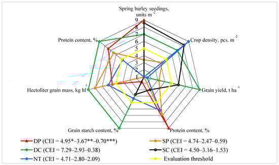where EPi represents the evaluation point for a given indicator; Xi is the observed value of that indicator; Xmax and Xmin are the maximum and minimum values recorded for that indicator, respectively. (3) The converted indicator values are presented on radial grids, with the radius scaled from 1 to 9, reflecting the evaluation points. (4) The scale also shows the average value of the individual indicators—the score threshold—which is equal to 5 and distinguishes between the high and the low scores. The effectiveness of the measure will be indicated by the area bounded by the scores of all its indicators. (5) The complex evaluation index (CEI), which consists of the average of the evaluation points, the standard deviation of the evaluation points, and the standard deviation of the average of the points below the evaluation threshold, is calculated.