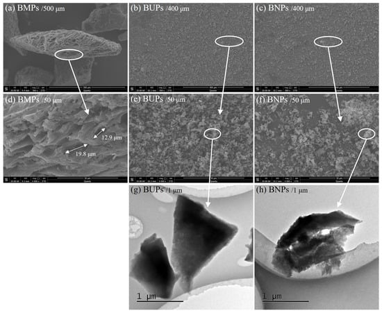 Apparent morphology of biochars with different particle sizes ((a–f): photos obtained using ESEM scanning electron microscopy; (g,h): photos obtained using SEM transmission electron microscopy).