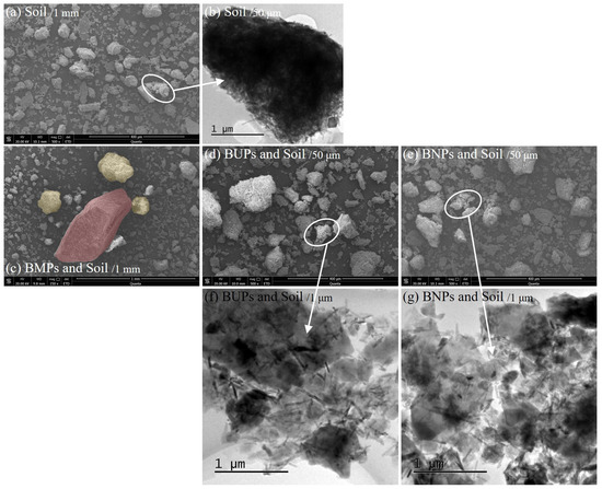 In contrast, the particles of BNPs mainly exist in agglomerated form, presenting a nano-fragmented crystalline structure. Figure 2 shows electron micrographs of the apparent morphology of the mixed media of biochar and soil. From Figure 2a, the soil particles had an irregular blocky structure with a rough surface and more porous structure (Figure 2b). Figure 2c shows the comparison of the external morphology of BMPs and soil particles. In the sampling comparison area, the size of BMPs was larger than that of normal soil microaggregates (diameter < 0.25 mm), and there was no adhesion between BMPs, soil particles, and microaggregates. In contrast to the BMPs, the contrast between the BUPs and BNPs and the surrounding soil particles was not obvious (Figure 2d,e). The particle sizes of the BUPs and BNPs were small, which was similar to that of the smallest particle size unit of the soil particles, and it was not possible to distinguish the morphology of the biochar particles at an observation scale of 50 μm. By performing observations at a higher-resolution scale, the BUPs and BNPs and the soil particles are were seen to be in the state of mutual adsorption (Figure 2f,g). The BUPs had a small amount of soil particles attached to their surface, while the BNPs, due to their smaller particle size, formed charcoal agglomerates that were interspersed and adsorbed together with the soil particles.