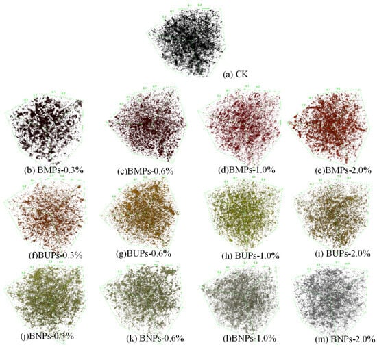 Other parameters of soil pore structure characteristics can be calculated using the BoneJ module, and the differences in soil pore connectivity (Coo.), anisotropy (DA), fractal dimension (FD), and volumetric porosity () as a function of biochar particle size and application are listed in Table 2. As can be seen from the table, the biochar amendments with different particle sizes had different effects on the characteristic parameters of soil pore structures. Compared to the CK treatment, the three particle sizes of the biochar treatments, BMP, BUP, and BNP, showed an overall tendency to reduce soil porosity. The differences in porosity became more significant as the amount of each application increased (Table 2). In the BMP treatment, soil porosity reached a minimum of 0.715% when the application rate was 1.0%, and soil porosity increased after more BMPs were applied. In the BUP treatment, soil porosity decreased significantly when the application rate exceeded 0.6%, and soil porosity fluctuated after more BUPs were applied. Changes in soil porosity caused by applying BNPs were generally consistent with those caused by applying BUPs in the treatments. Soil’s pore connectivity was significantly lower in all biochar treatments than in the control treatment.
