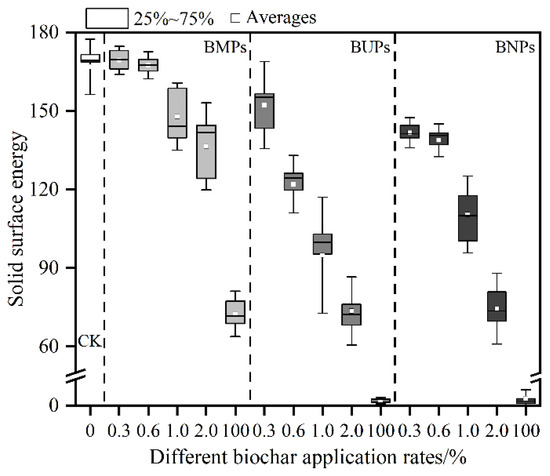 Figure 5 shows the contact angle values of different types and application amounts of biochar–soil hybrid media. The figure shows that the contact angle of BMPs is less than 90°, which is a hydrophilic material, while the contact angle of both BUPs and BNPs is more than 120°, which shows strong hydrophobicity. The solid surface energies of the different biochar particles were calculated based on the Fokes model (Figure 6), and the solid surface energies of the biochar particles decreased as the particle sizes decreased. The changes in hydrophilicity and hydrophobicity due to the different particle sizes of the biochars are mainly due to the changes in their hydrophilic functional groups. The surface of BMPs contained abundant hydrophilic functional groups such as -OH, -CHO, -COOH, etc. As the particle sizes of the biochars decreased, the hydrophilic functional groups on their surfaces were gradually reduced or even disappeared, resulting in the original hydrophilicity of the large biochar particles being transformed into the hydrophobicity of the small biochar particles. The improved chalky clay soil showed strong hydrophilicity (Figure 5). The contact angle values increased after applying BMPs to the soil, but fell into the stronger hydrophilicity category. The contact angle values increased rapidly after the application of BUPs and BNPs to the soil, and the contact angle values of the mixed media were close to the cut-off values of hydrophilicity and hydrophobicity when the amount of each was 2.0%, and the BUPs and BNPs were not conducive to the hydrophilic development of the soil particles.