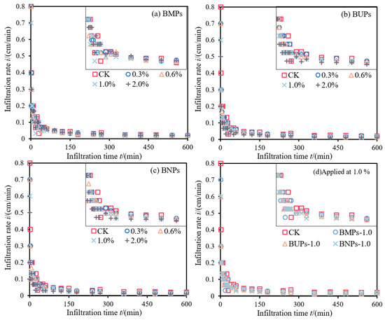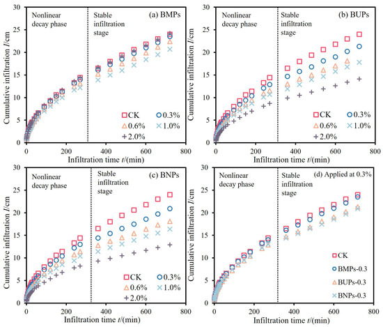 (2) The BNPs-2.0% treatment was the most effective in reducing soil infiltration. Calculation of the steady-state infiltration rate, approximate saturated hydraulic conductivity, and interfacial suction through the parameters of the well-fitted Philip model also showed that the BNPs-2.0% treatment had the strongest inhibiting effect on water infiltration.