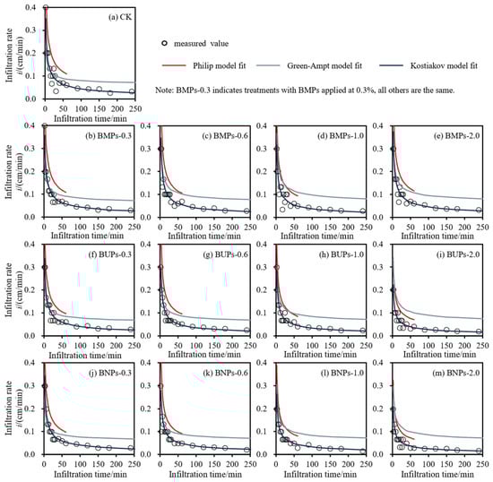 The relationship between the soil infiltration rate and infiltration time is shown in Figure 8. The infiltration rate decreases with increasing infiltration time, showing a non-linear decay trend, and it stabilizes at a certain point in time. In the pre-infiltration phase, the infiltration rate was significantly lower in the biochar application treatment than in the control treatment during the rapid decay phase of the infiltration rate, further indicating that biochar application can slow the infiltration of soil moisture. In terms of comparative differences between the different applications, the infiltration rate in the BMP treatment did not show a more obvious distribution pattern, whereas in the BUP and BNP treatments, the infiltration rate decreased with increasing application amount, but did not show a large difference interval. The Philip, Green-Ampt, and Kostiakov models were used to fit the infiltration rate under the influence of different structural biochar applications, respectively, and the results are shown in Figure 8. Since the Philip model for determining the infiltration rate is affected by the timescale and soil structure, it is generally applicable to short-term infiltration, and the soil matrix potential is dominant, and the time reference zone selected in each one-dimensional infiltration process is not unique, but must be determined according to the actual infiltration process. Therefore, in this study, the change in infiltration rate with infiltration time from 0 to 60 min was used to fit the Philip model. Both the Green-Ampt model and the Kostiakov model were fitted and analyzed using the process of infiltration rate change with infiltration time in the range of 0–250 min. The fitting results of the three infiltration models show that the fitting curve of the Green-Ampt model was higher than the measured curve in the middle and later stages, and the fitted value was large, and the fitting results of the Philip model also showed a large fitted value, while the Kostiakov model outperformed the Philip and Green-Ampt models in describing the relationship between infiltration rate and infiltration time, and the fitting curve basically coincided with the measured curve. The fitted curves are in good agreement with the measured curves and the correlation coefficients R2 > 0.91.