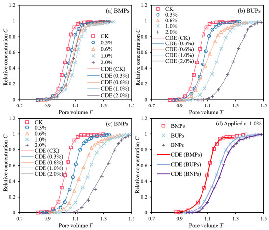 In contrast, the effluent volume at initial penetration gradually increased with increasing biochar application, and the overall solute penetration curve shifted backward with increasing application. However, differences in biochar particle size were also reflected in the solute penetration curves. In the BMP application treatment, the increasing trend of the relative concentration C with the increase in the pore volume number T gradually slowed down with the increase in the applied amount, and the trailing characteristics of the curves were more obvious. In the BUP and BNP treatments, the increasing trend of the solute penetration curves slowed down significantly, and there was a significant difference between the curves with the increase in the applied amount, and the trailing characteristics of the curves were very substantial. When the applied amount was 2.0%, the pore volume T reached 1.5 at full penetration in the small-particle-size biochar applied treatment. The above results show that different structures of biochar have various degrees of influence on the solute infiltration process.